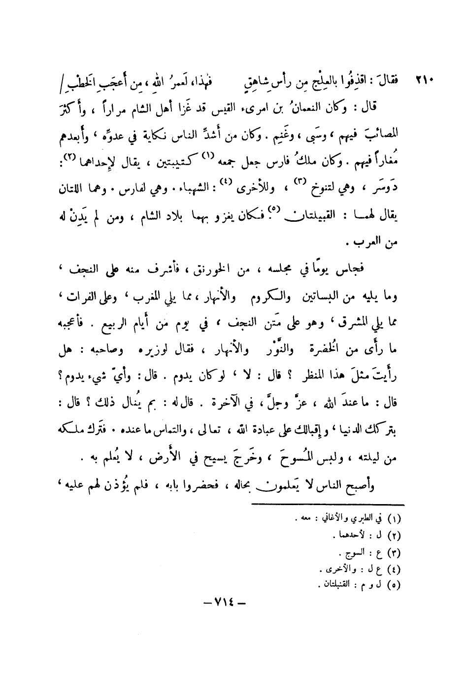 قال: وكان النعمان بن امرئ القيس قد غزا أهل الشام مرارا، وأكثر المصائب فيهم، وسبى، وغنم. وكان من أشد الناس نكاية في عدوه، وأبعدهم مغاراً فيهم. وكان ملك فارس جعل جمعه كتيبتين، يقال لإحداهما: دوسر، وهي لتنوخ، وللأخرى: الشهباء. وهي لفارس. وهما اللتان يقال لهما: القبيلتان. فكان يغزو بهما بلاد الشام، ومن لم يدن له من العرب.
