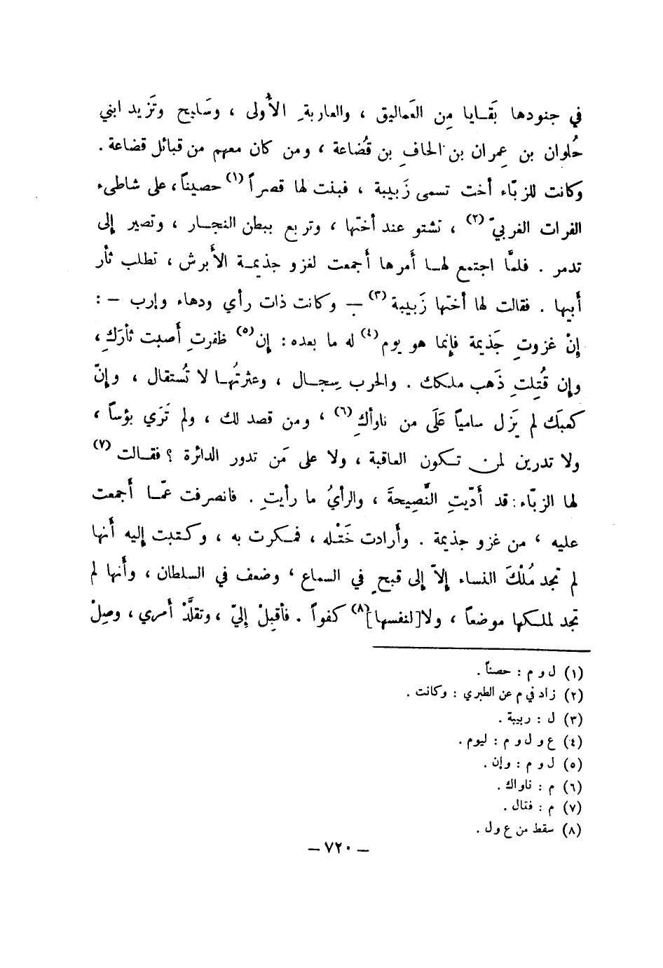 في جنودها بقايا من العماليق، والعاربة الأولى، وسليح وتزيد ابني حلوان بن عمران بن الحاف بن قضاعة، ومن كان معهم من قبائل قضاعة. وكانت للزباء أخت تسمى زبيبة، فبنت لها قصراً حصيناً، على شاطئ الفرات الغربي، تشتو عند أختها، وتربع ببطن النجار، وتصير إلى تدمر. فلما اجتمع لها أمرها أجمعت لغزو جذيمة الأبرش، تطلب ثأر أبيها. فقالت لها أختها زبيبة - وكانت ذات رأي ودهاء وإرب -: إن غزوت جذيمة فإنما هو يوم له ما بعده: إن ظفرت أصبت ثأرك، وإن قتلت ذهب ملكك. والحرب سجال، وعثرتها لا تستقال، وإن كعبك لم يزل سامياً على من ناوأك، ومن قصد لك، ولم تري بؤساً، ولا تدرين لمن تكون العاقبة، ولا على من تدور الدائرة؟ فقالت لها الزباء: قد أديت النصيحة، والرأي ما رأيت. فانصرفت عما أجمعت عليه، من غزو جذيمة. وأرادت ختله، فمكرت به، وكتبت إليه أنها لم تجد ملك النساء إلا إلى قبحٍ في السماع، وضعف في السلطان، وأنها لم تحد لملكها موضعاً، ولا [لنفسهاٍ كفواً. فأقبل إلي، وتقلد أمري، وصل