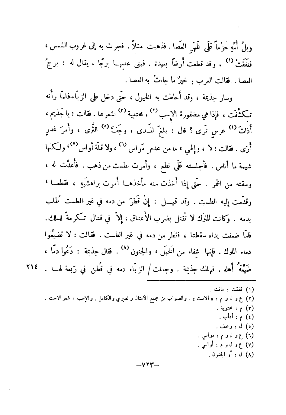 وسار جذيمة، وقد أحاطت به الخيول، حتى دخل على الزباء فلما رأته تكشفت، فإذا هي مضفورة الإسب، محتبية بشعرها. فقالت: يا جذيم، أذات عرسٍ ترى؟ قال: بلغ المدى، وجف الثرى، وأمر غدرٍ أرى. فقالت: لا، وإلهي، ما من عدم مواس، ولا قلة أواس، ولكنها شيمة ما أناس. فأجلسته على نطع، وأمرت بطست من ذهب، فأعدت له، وسقته من الخمر حتى إذا أخذت منه مأخذها أمرت براهشيه، فقطعا، وقدمت إليه الطست. وقد قيل: إن قطر من دمه في غير الطست طلب بدمه. وكانت الملوك لا تقتل بضرب الأعناق، إلا في قتال تكرمةً للملك فلما ضعفت يداه سقطتا، فقطر من دمه في غير الطست. فقالت: لا تضيعوا دماء الملوك. فإنها شفاء من الخبل، والجنون. فقال جذيمة: دعوا دماً، ضيعه أهله فهلك جذيمة. وجعلت الزباء دمه في قطن في ربعة لها.