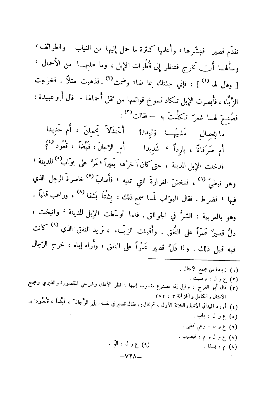 تقدم قصير فبشرها، وأعلمها كثرة ما حمل إليها من الثياب والطرائف، وسألها أن تخرج فتنظر إلى قطرات الإبل، وما عليها من الأحمال، [وقال لها] : فإني جئتك بما ضاء وصمت. فذهبت مثلاً. فخرجت الزباء، فأبصرت الإبل تكاد تسوخ قوائمها من ثقل أحمالها. قال أبو عبيدة: فصنع لها شعر تكلمت به - فقالت: