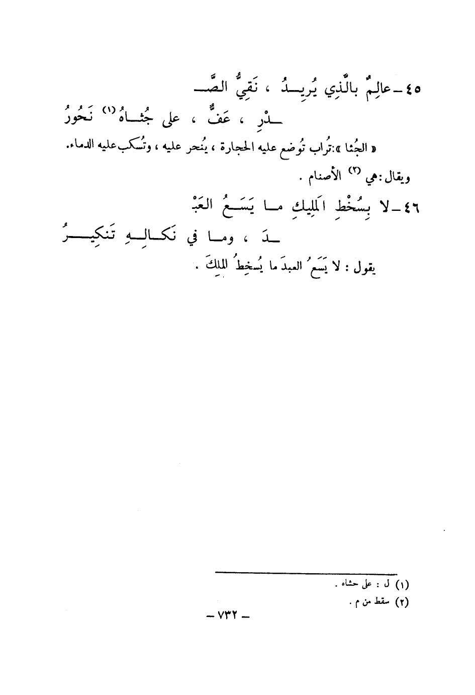 "الجثا": تراب توضع عليه الحجارة، ينحر عليه، وتسكب عليه الدماء. ويقال: هي الأصنام.