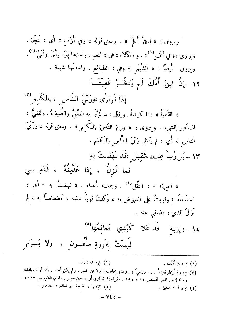 "القفية": الكرامة. ويقال: ما يؤثر به الصبي والضيف. والقفي: المأثور بالشيء. ويروى: "ورام الناس بالكلم". ومعنى قوله "ورمي الناس" أي: لم ينظر رمي الناس بالكلم.