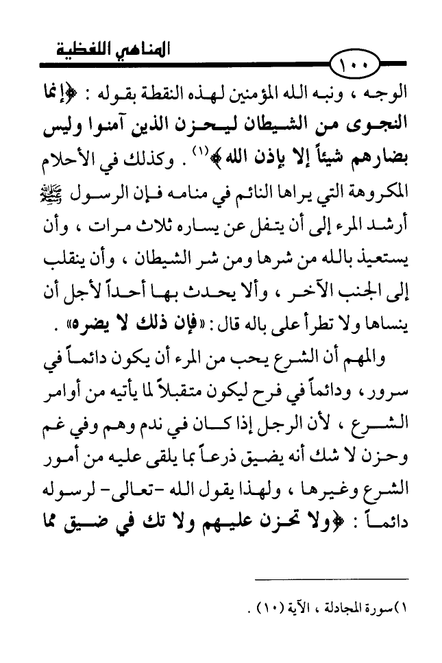الوجه، ونبه الله المؤمنين النقطة بقوله:) إنما النجوى من الشيطان ليحزن الذين آمنوا وليس بضارهم شيئاً إلا بإذن الله ((¬1) . وكذلك في الأحلام المكروهة التي يراها النائم في منامه فإن الرسول صلى الله عليه وسلم أرشد المرء إلى أن يتفل عن يساره ثلاث مرات، وأن يستعيذ بالله من شرها ومن شر الشيطان، وأن ينقلب إلى الجنب الآخر، وألا يحدث بها أحداً لأجل أن ينساها ولا تطرأ على باله قال: " فإن ذلك لا يضره ". والمهم أن الشرع يحب من المرء أن يكون دائما في سرور، ودائما في فرح ليكون متقبلا لما يأتيه من أوامر الشرع، لأن الرجل إذا كان في ندم ووهم وفي غم وحزن لا شك انه يضيق ذرعا بما يلقي عليه من أمور الشرع وغيرها، ولهذا يقول الله - تعالى - لرسوله دائما:) وَلا تَحْزَنْ عَلَيْهِمْ وَلا تَكُ فِي ضَيْقٍ مِمَّا