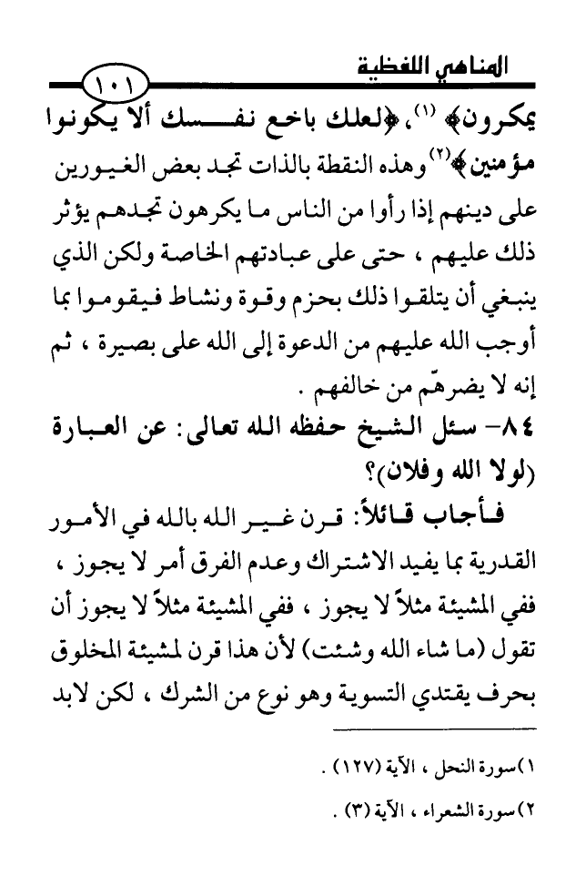 84. ... سئل فضيلة الشيخ: عن العبارة (لولا الله وفلان) ؟ .