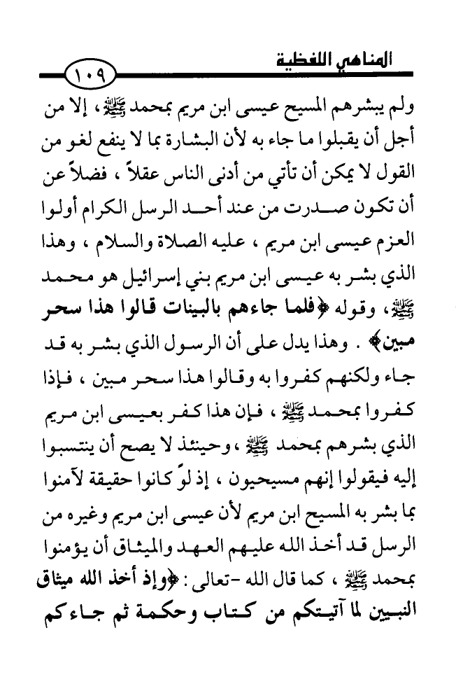 ولم يبشرهم المسيح عيسى ابن مريم بمحمد صلى الله عليه وسلم، إلا من أجل أن يقبلوا ما جاء به لأن البشارة بما لا ينفع لغو من القول لا يمكن أن تأتي من أدنى الناس عقلا، فضلا عن أن تكون صدرت من عند أحد الرسل الكرام أولو العزم عيسى ابن مريم، عليه الصلاة والسلام، وهذا الذي بشر به عيسى ابن مريم بني إسرائيل هو محمد صلى الله عليه وسلم، وقوله:) فلما جاءهم بالبيانات قالوا هذا سحر مبين (. وهذا يدل على أن الرسول الذي بشر به قد جاء ولكنهم كفرو به وقالوا هذا سحر مبين، فإذا كفرو بمحمد صلى الله عليه وسلم فإن هذا كفر بعيسى ابن مريم الذي بشرهم بمحمد صلى الله عليه وسلم، وحينئذ لا يصح أن ينتسبوا إليه ... فيقولوا إنهم مسيحيون، إذ لو كانوا حقيقة لآمنوا بما بشر به المسيح ابن مريم لأن عيسى ابن مريم وغيره من الرسل قد أخذ الله عليهم العهد والميثاق أن يؤمنوا بمحمد صلى الله عليه وسلم، كما قال الله - تعالى) وإذ أخذ الله ميثاق النبيين لما آتيتكم من كتاب وحكمة ثم جاءكم