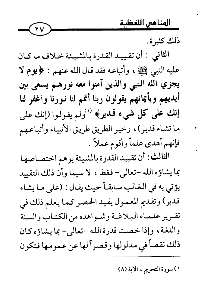 الثاني: أن تقييد القدرة بالمشيئة خلاف ما كان عليه النبي صلى الله عليه وسلم، وأتباعه فقد قال الله عنهم:) يوم لا يخزي الله النبي والذين آمنوا معه نورهم يسعى بين أيديهم وبأيمانهم يقولون ربنا أتمم لنا نورنا واغفر لنا إنك على كل شئ قدير ((¬1) . ولم يقولوا (إنك على ما تشاء قدير) ، وخير الطريق طريق الأنبياء وأتباعهم فإنهم أهدى علماً وأقوم عملاً.