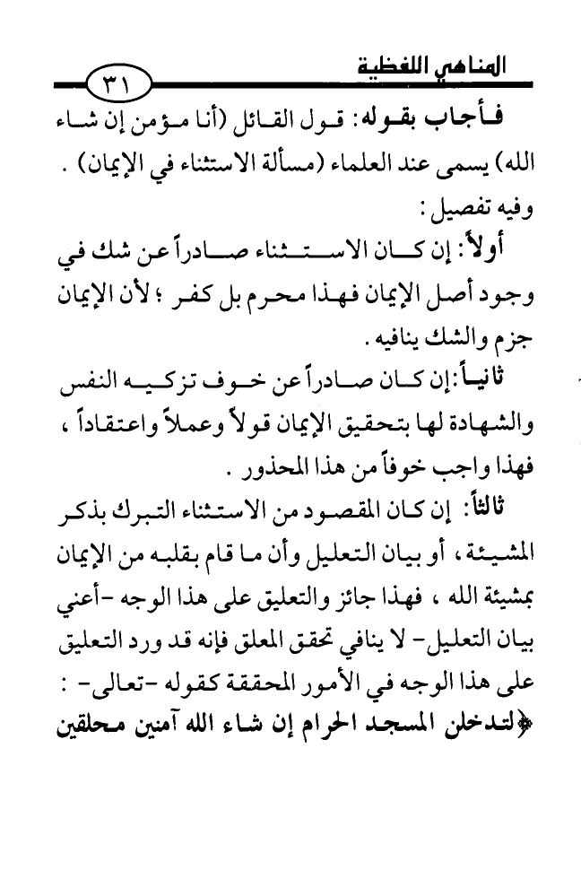 ثالثاً: إن كان المقصود من الاستثناء التبرك بذكر المشيئة، أو بيان التعليل وأن ما قام بقلبه من الإيمان بمشية الله، فهذا جائز التعليق على هذا الوجه - أعني بيان التعليل - لا ينافي تحقق المعلق فإنه قد ورد التعليق على هذا الوجه في الأمور المحققة كقوله - تعالى -:) لتدخلن المسجد الحرام إن شاء الله آمنين محلقين