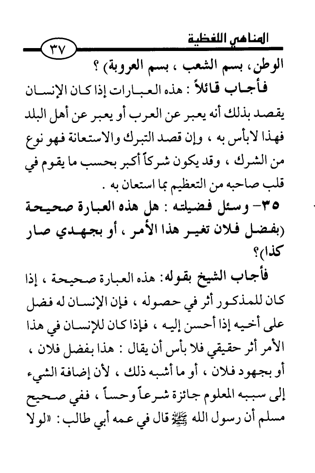 35. ... وسئل فضيلته: هل هذه العبارة صحيحة (بفضل فلان تغير هذا الأمر، أو بجهدي صار كذا) ... ؟ .