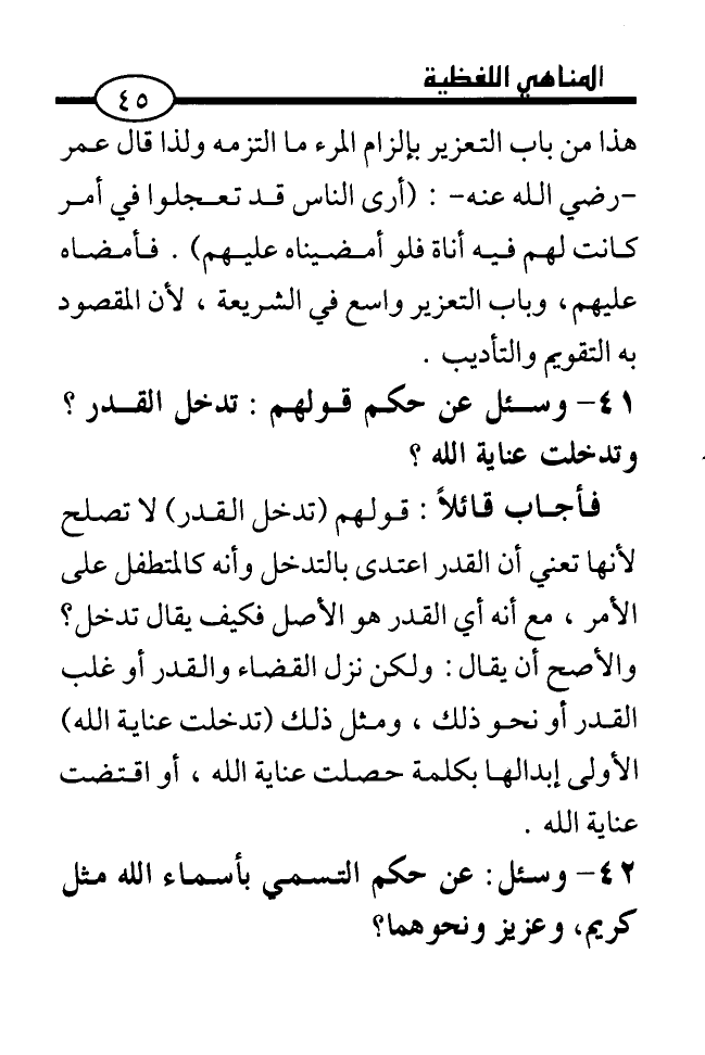 41. ... وسئل: عن حكم قولهم: تدخل القدر؟ وتدخلت عناية الله؟