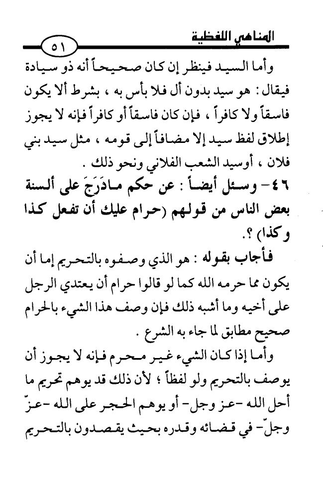 46. ... وسئل أيضاً: عن حكم ما درج على ألسنة بعض الناس من قولهم (حرام عليك أن تفعل كذا وكذا) ؟