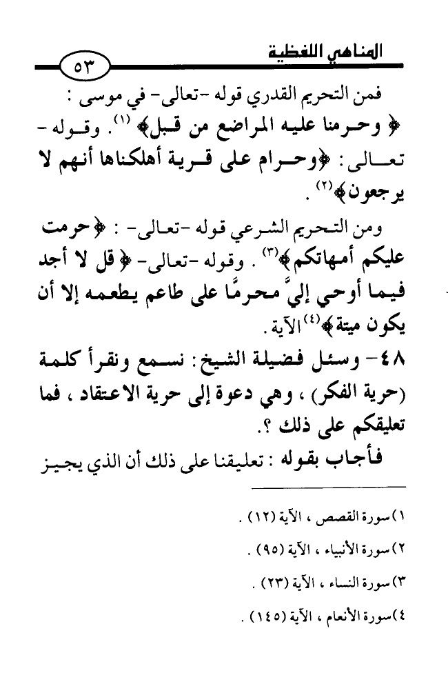 48. ... وسئل فضيلة الشيخ: نسمع ونقرأ كلمة (حرية الفكر) ، وهي دعوة إلى حرية الاعتقاد، فيما تعليقكم على ذلك؟