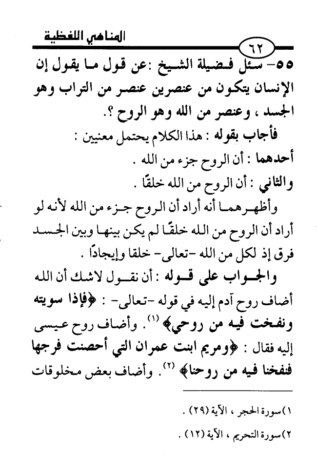 55. ... سئل فضيلة الشيخ: عن قول ما يقول إن الإنسان يتكون من عنصرين عنصر من التراب وهو الجسد، وعنصر من الله وهو الروح؟ .