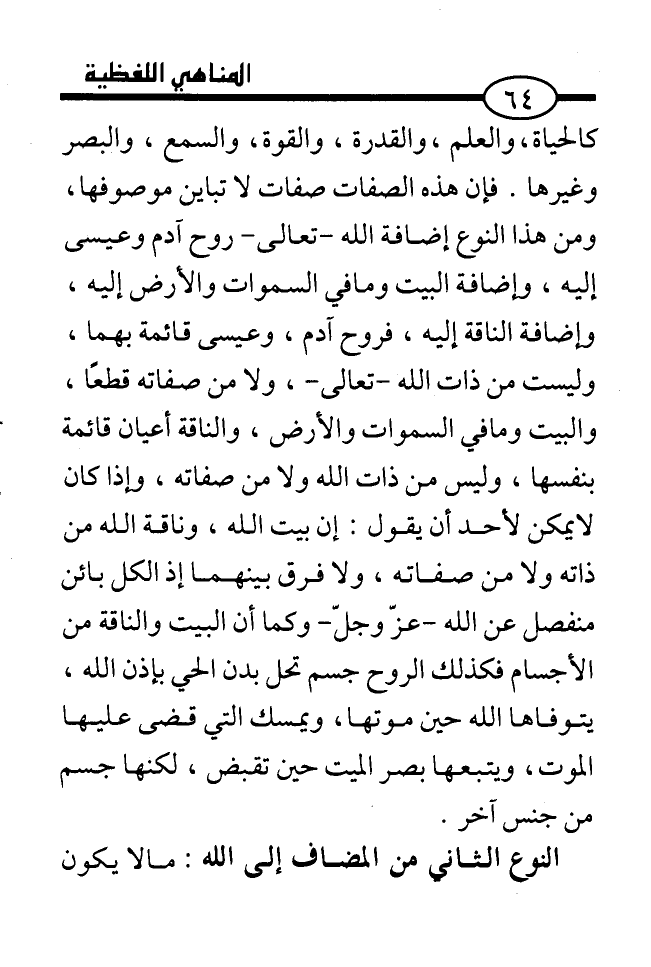 كالحياة، والعلم، والقدرة، والقوة، والسمع، والبصر، وغيرها. فإن هذه الصفات صفات لا تباين موصوفها، ومن هذا النوع إضافة الله - تعالى - روح آدم وعيسى إليه، وإضافة البيت وما في السموات والأرض إليه، وإضافة الناقة إليه، فروح آدم، وعيسى قائمة بهما، وليست من ذات الله - تعالى -، ولا من صفاته قطعاً، والبيت وما في السموات والأرض، والناقة أعيان قائمة بنفسها، وليس من ذات الله ولا من صفاته، وإذا كان لا يمكن لاحد أن يقول: إن بيت الله، وناقة الله من ذاته ولا من صفاته، ولا فرق بينهما إذ الكل بائن منفصل عن الله - عزل وجل - وكما أن البيت والناقة من الأجسام فكذلك الروح جسم تحل بدن الحي بإذن الله، يتوفاها الله حين موتها، ويمسك التي قضى عليها الموت، ويتبعها بصر الميت حين تقبض، لكنها جسم من جنس آخر.
