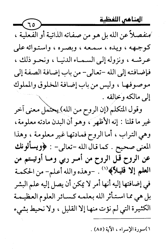 وقول المتكلم (إن الروح من الله) يحتمل معنى آخر غير ما قلنا: إنه الأظهر، وهو أن البدن مادته معلومة، وهي التراب، أما الروح فمادتها غير معلومة، وهذا المعنى صحيح. كما قال الله - تعالى -) ويسألونك عن الروح قل الروح من أمر ربي وما أوتيتم من العلم إلا قليلاً ((¬1) . - وهذه والله أعلم - من الحكمة في إضافتها إليه أنها أمر لا يمكن أن يصل إليه علم البشر بل هي مما استأثر الله بعلمه كسائر العلوم العظيمة الكثيرة التي لم نؤت منها إلا القليل، ولا نحيط بشيء