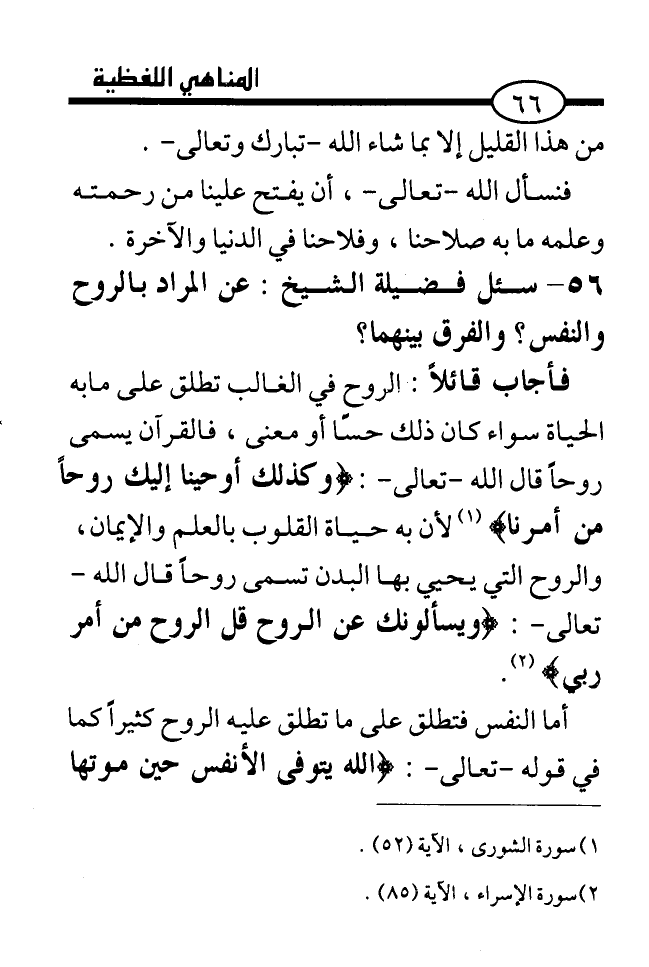 56. ... سئل فضيلة الشيخ: عن المراد بالروح والنفس؟ والفرق بينهما؟ .