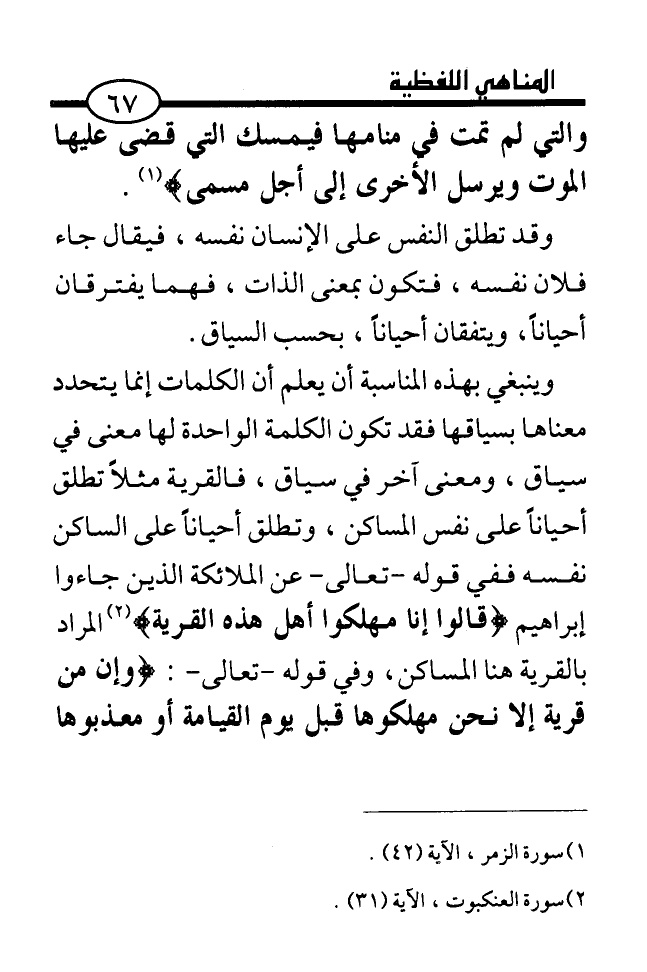 وينبغي بهذه المناسبة أن يعلم أن الكلمات إنما يتحدد معناها بسياقها فقد تكون الكلمة الواحدة لها معنى في سياق، ومعنى آخر في سياق، فالقرية مثلا تطلق أحيانا على نفس المساكن، وتطلق أحيانا على الساكن نفسه ففي قوله - تعالى - عن الملائكة الذين جاءوا إبراهيم) قالوا إنا مهلكوا أهل هذه القرية ((¬2)