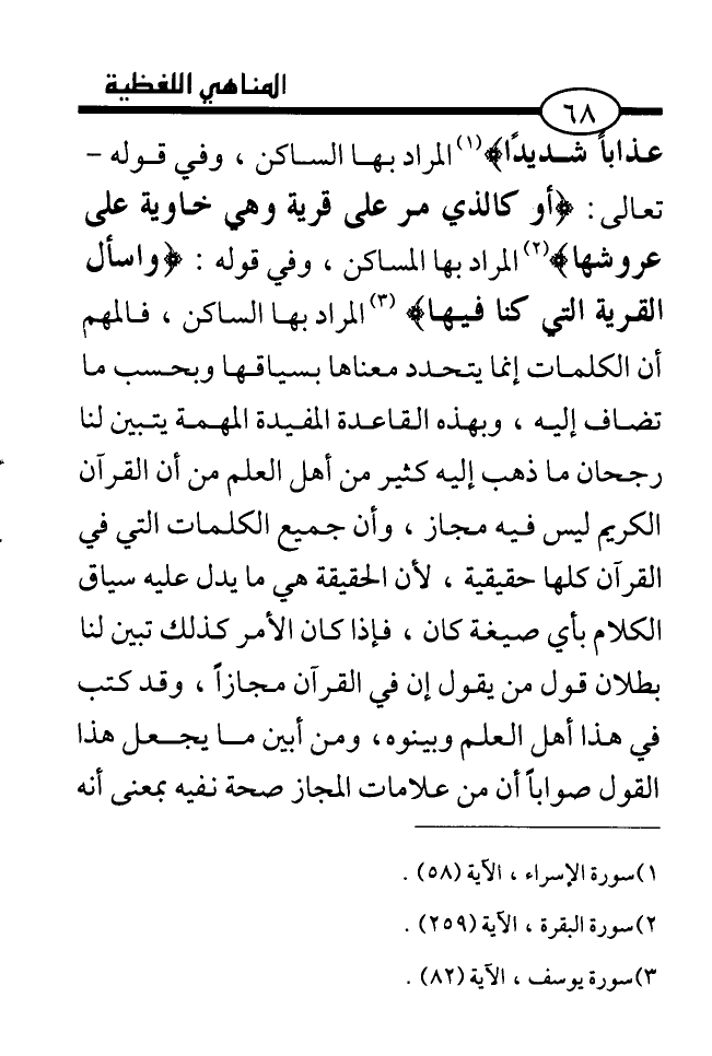 عذاباً شديداً ((¬1) المراد بها المساكن، وفي قوله - تعالى:) أو كالذي مر على قرية هي خاوية على عروشها ((¬2) المراد بها المساكن، وفي قوله:) وأسأل القرية التي كنا فيها ((¬3) المراد بها الساكن، فالمهم أن الكلمات إنما يتحدد معناها بسياقها وبحسب ما تضاف إليه، وبهذه القاعدة المفيدة المهمة يتبين لنا رجحان ما ذهب إليه كثير من أهل العلم من أن القران الكريم ليس فيه مجاز، وأن جميع الكلمات التي في القران كلها حقيقة، لان الحقيقة هي ما يدل عليه سياق الكلام بأي صيغة كان، فإذا كان الأمر كذلك تبين لنا بطلان قول من يقول إن في القران مجازا، وقد كتب في هذا أهل العلم وبينوه، ومن أبين ما يجعل هذا القول صوابا أن من علامات المجاز صحة نفيه بمعنى أنه
