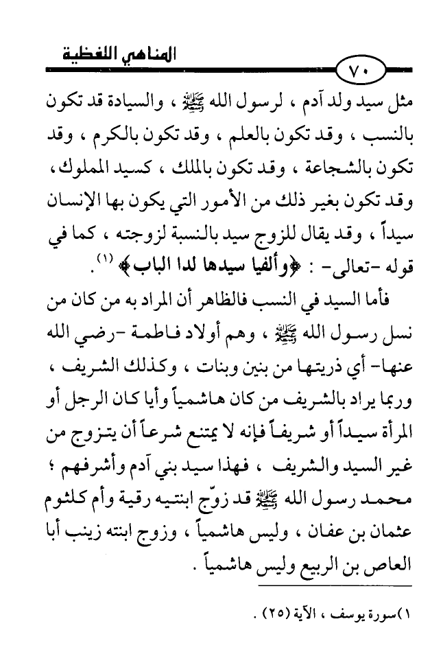 مثل سيد ولد آدم، لرسول الله صلى الله عليه وسلم، والسيادة قد تكون بالنسب، وقد تكون بالعلم، وقد تكون بالكرم، وقد تكون بالشجاعة، وقد تكون بالملك، كسيد المملوك وقد تكون بغير ذلك من الأمور التي يكون بها الإنسان سيدا، وقد يقال للزوج سيد بالنسبة لزوجته، كما في قوله - تعالى -:) وألفيا سيدها لدا الباب ((¬1) .