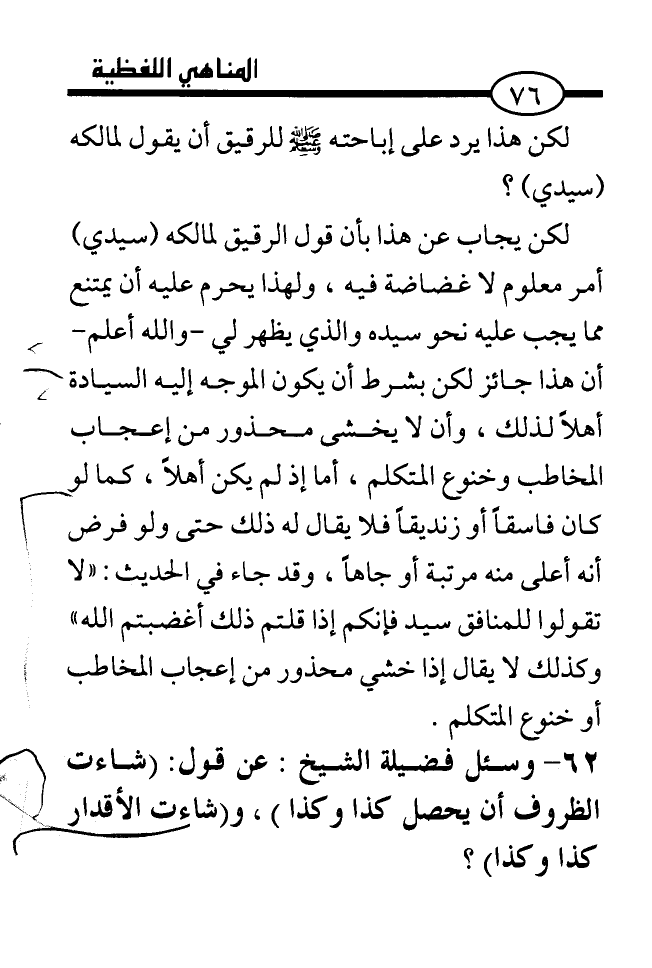 لكن يجاب عن هذا بأن قول الرقيق لمالكه (سيدي) أمر معلوم لا غضاضة فيه، ولهذا يحرم عليه أن يمتنع مما يجب عليه نحو سيده والذي يظهر لي - والله أعلم - أن هذا جائز لكن بشرط أن يكون الموجه إليه السيادة أهلا لذلك، وأن لا يخشى محذور من إعجاب المخاطب وخنوع المتكلم، أما إذ لم يكن أهلا، كما لو كان فاسقا أو زنديقا فلا يقال له ذلك حتى ولو فرض عنه أعلى منه مرتبة أو جاهلا وقد جاء في الحديث: " لا تقولوا للمنافق سيد فإنكم إذ قلتم ذلك أغضبتم الله ".