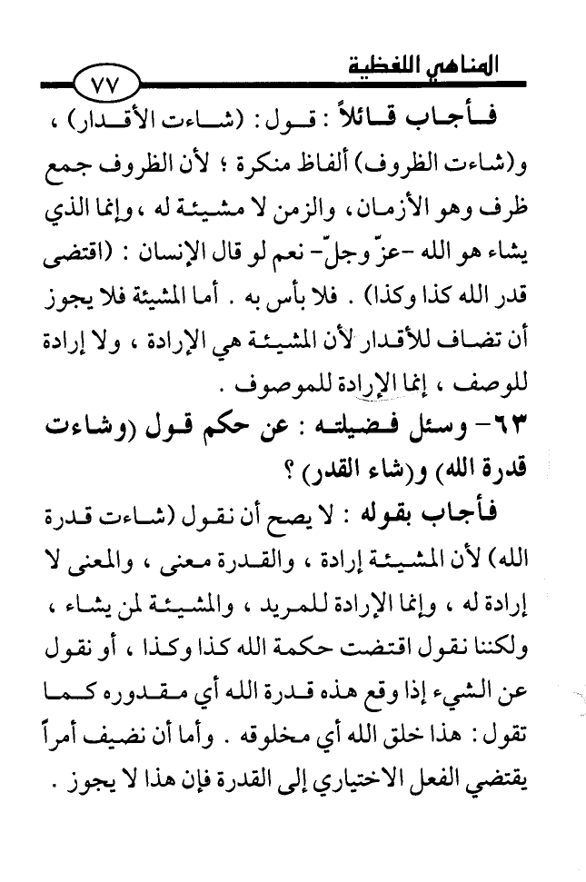 فأجاب بقوله: لا يصح أن نقول (شاءت قدرة الله) لأن المشيئة إرادة، والقدرة معنى، والمعنى لا إرادة له، وإنما الإرادة للمريد، والمشيئة لمن يشاء، ولكننا نقول اقتضت حكمة الله كذا وكذا، أو نقول عن الشئ إذا وقع هذه قدرة الله أي مقدوره كما تقول: هذا خلق الله أي مخلوقه. وأما أن نضيف أمرا يقتضي الفعل الاختياري إلى القدرة فإن هذا لا يجوز