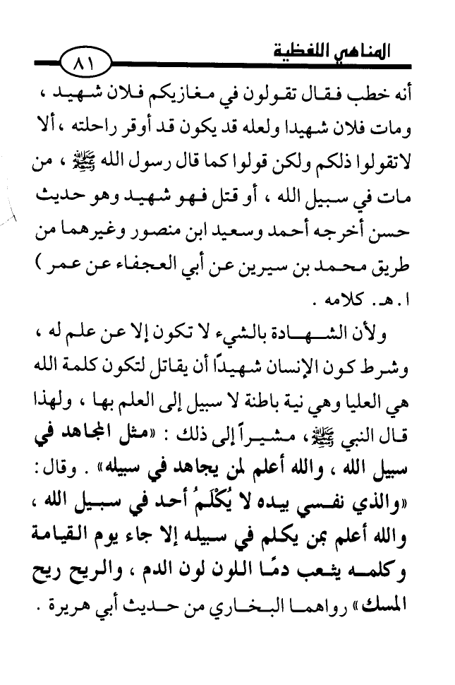 ولأن الشهادة بالشيء لا تكون إلا عن علم له، وشرط كون الإنسان شهيدا أن يقاتل لتكون كلمة الله هي العليا وهي نية باطنة لا سبيل إلى العلم بها، ولهذا قال النبي صلى الله عليه وسلم، مشيرا إلى ذلك: " مثل المجاهد في سيبل الله، والله أعلم بمن يجاهد في سبيله ". وقال: " والذي نفسي بيده لا يكلم أحد في سبيل الله، والله أعلم بمن يكلم في سبيله إلا جاء يوم القيامة وكلمه يثعب دما اللون لون الدم، والريح ريح المسك ". رواهما البخاري من حديث أبى هريرة.