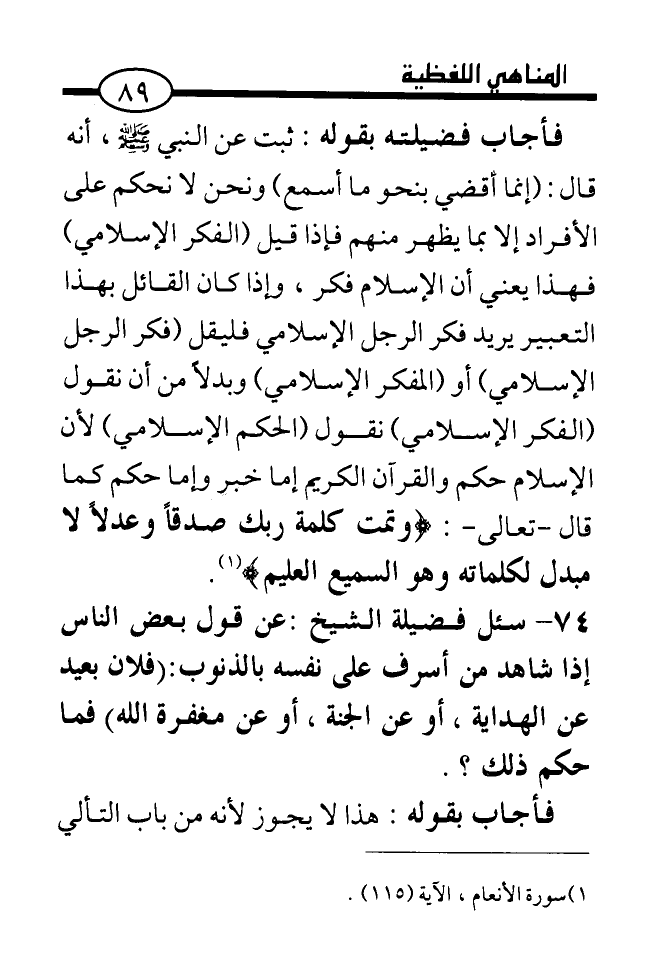 فأجاب قائلا: ثبت عن النبي صلى الله عليه وسلم، أنه قال: (إنما أقضي نحو ما أسمع) ونحن لا نحكم على الأفراد إلا بما يظهر منهم فإذا قيل (الفكر الإسلامي) فهذا يعني أن الإسلام فكر، وإذا كان القائل بهذا التعبير يريد فكر الرجل الإسلامي فليقل (فكر الرجل الإسلامي) أو (المفكر الإسلامي) وبدلا من أن نقول (الفكر الإسلامي) نقول (الحكم الإسلامي) لأن الإسلام حكم والقرآن الكريم إما خبر وإما حكم كما قال - تعالى -:) وتمت كلمة ربك صدقا وعدلا لا مبدل لكلماته وهو السميع العليم ((¬1) .