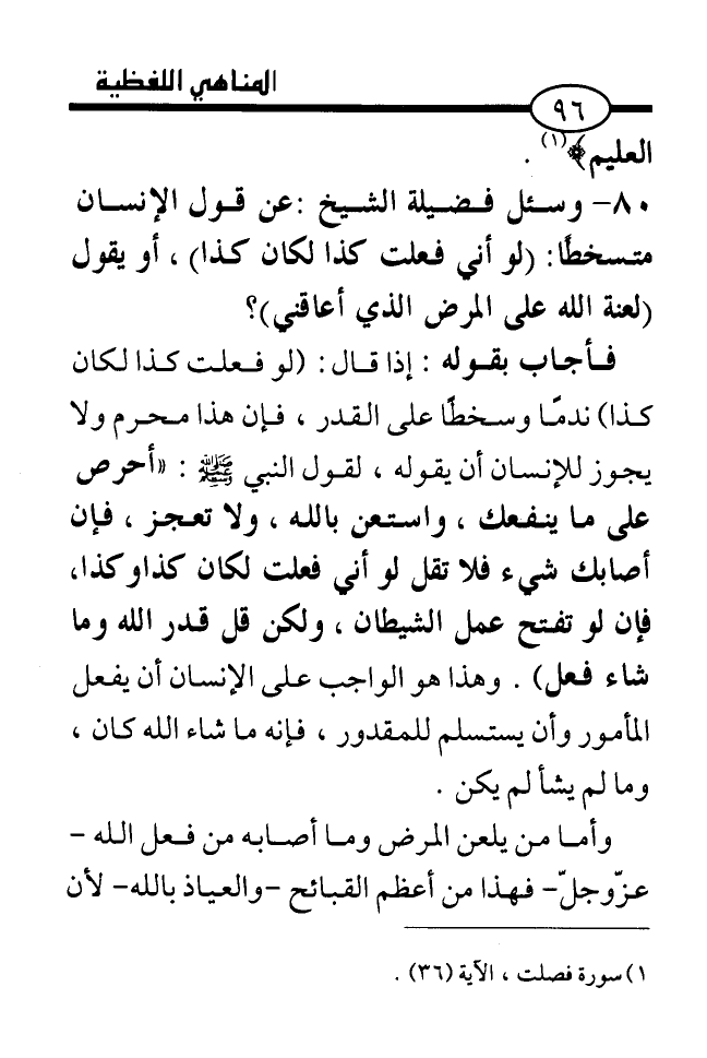 80. ... وسئل فضيلة الشيخ: عن قول الإنسان متسخطا: (لو إني فعلت كذا لكان كذا) ، أو يقول (لعنه الله على المرض الذي أعاقني) ؟ .