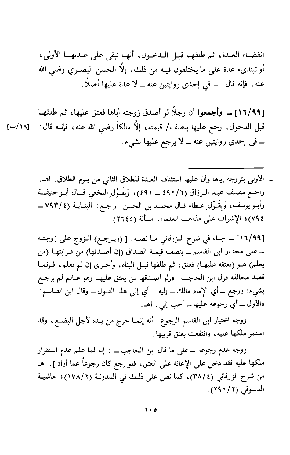 [99/ 16]-وأجمعوا أن رجلا لو أصدق زوجته أباها فعتق عليها، ثم طلقها قبل الدخول، رجع عليها بنصف/قيمته، إلا مالكاً رضي الله عنه، فإنه قال: -في إحدى روايتين عنه- لا يرجع عليها بشيء.