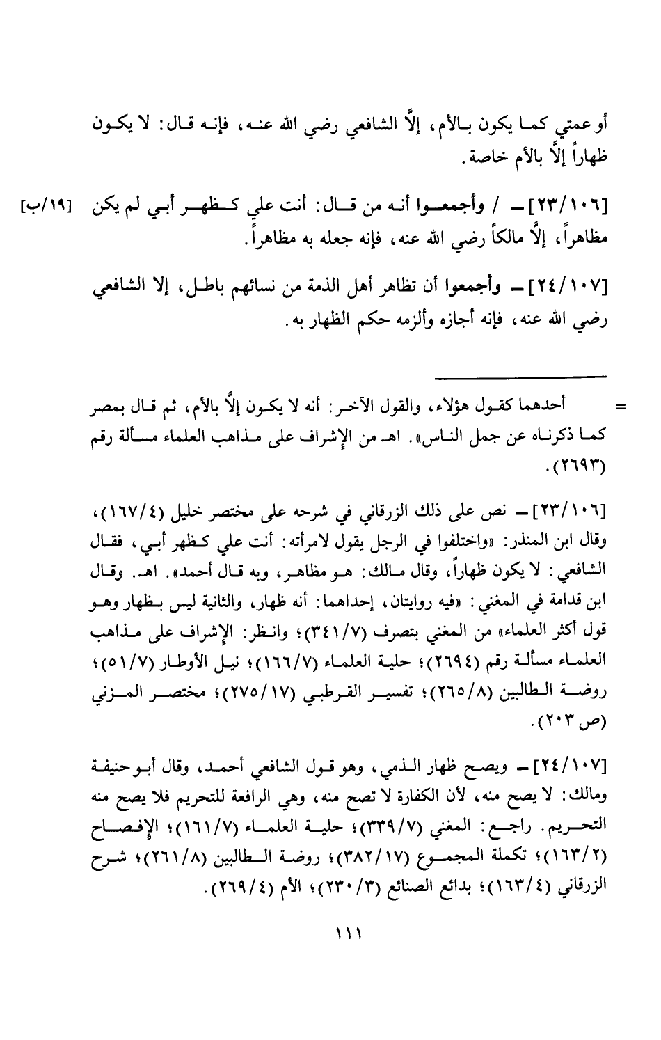 [106/ 23]- وأجمعوا أنه من قال: أنت علي كظهر أبي لم يكن مظاهرًا، إلا مالكًا رضي الله عنه، فإنه جعله مظاهرًا.
