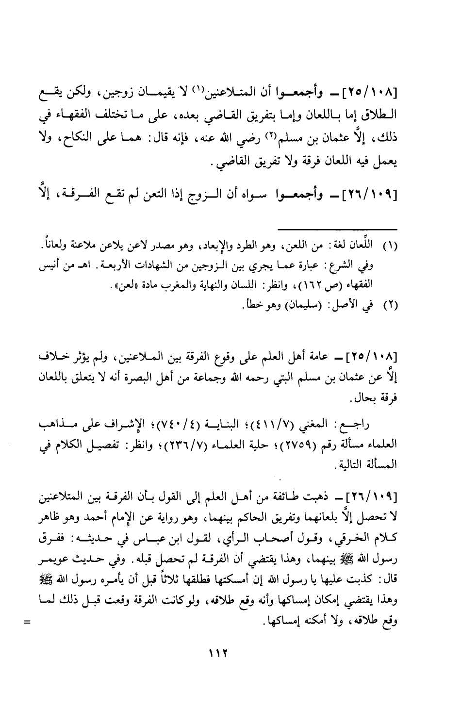 [109/ 26]- وأجمعوا سواء أن الزوج إذا التعن لم تقع الفرقة، إلا
