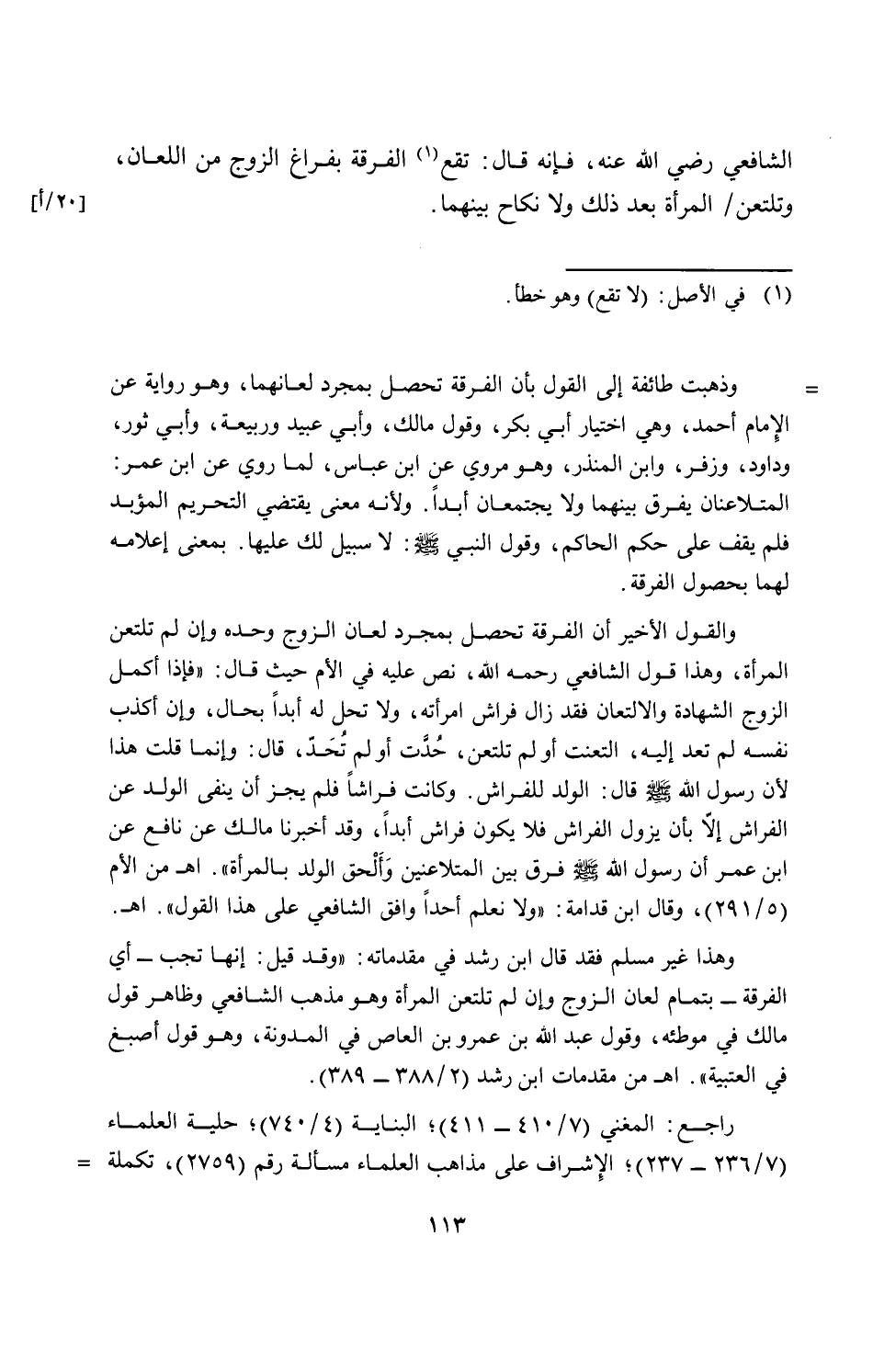 الشافعي رضي الله عنه، فإنه قال: تقع الفرقة بفراغ الزوج من اللعان، وتلتعن المرأة بعد ذلك ولا نكاح بينهما.