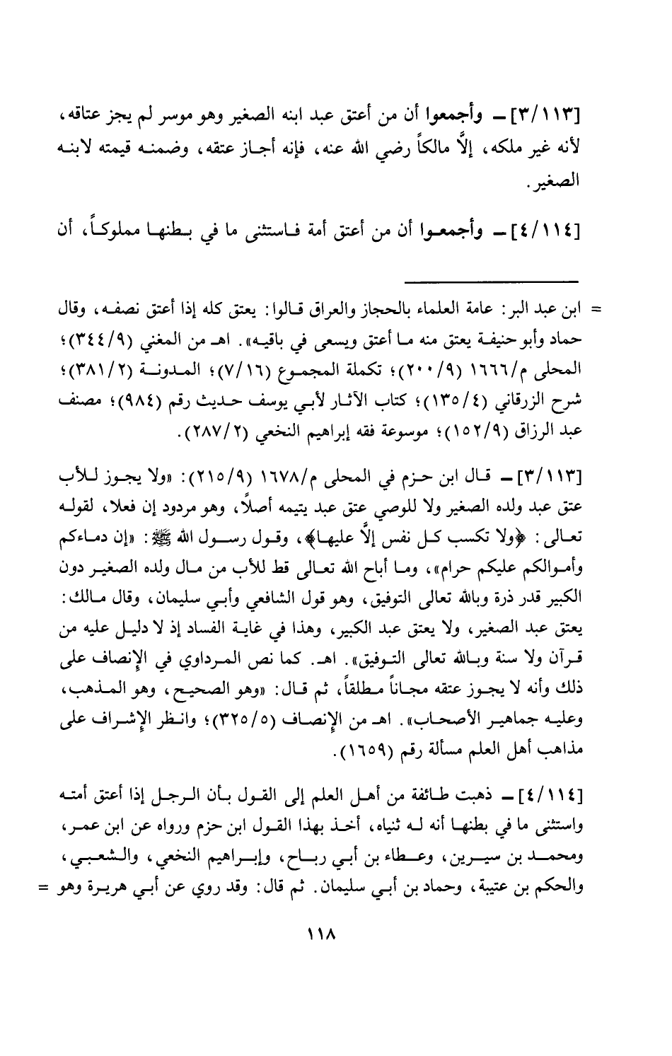 [113/ 3]- وأجمعوا أن من أعتق عبد ابنه الصغير وهو موسر لم يجز عتاقه، لأنه غير ملكه، إلا مالكًا رضي الله عنه، فإنه أجاز عتقه، وضمنه قيمته لابنه الصغير.