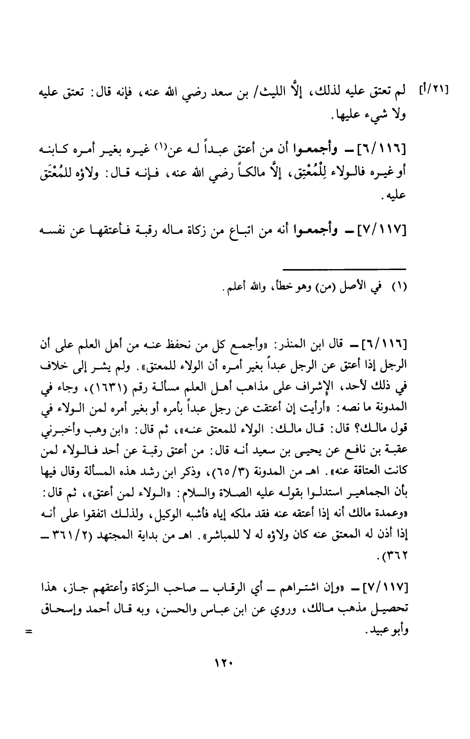 [117/ 7]- وأجمعوا أنه من اتباع من زكاة ماله رقبة فأعتقها عن نفسه