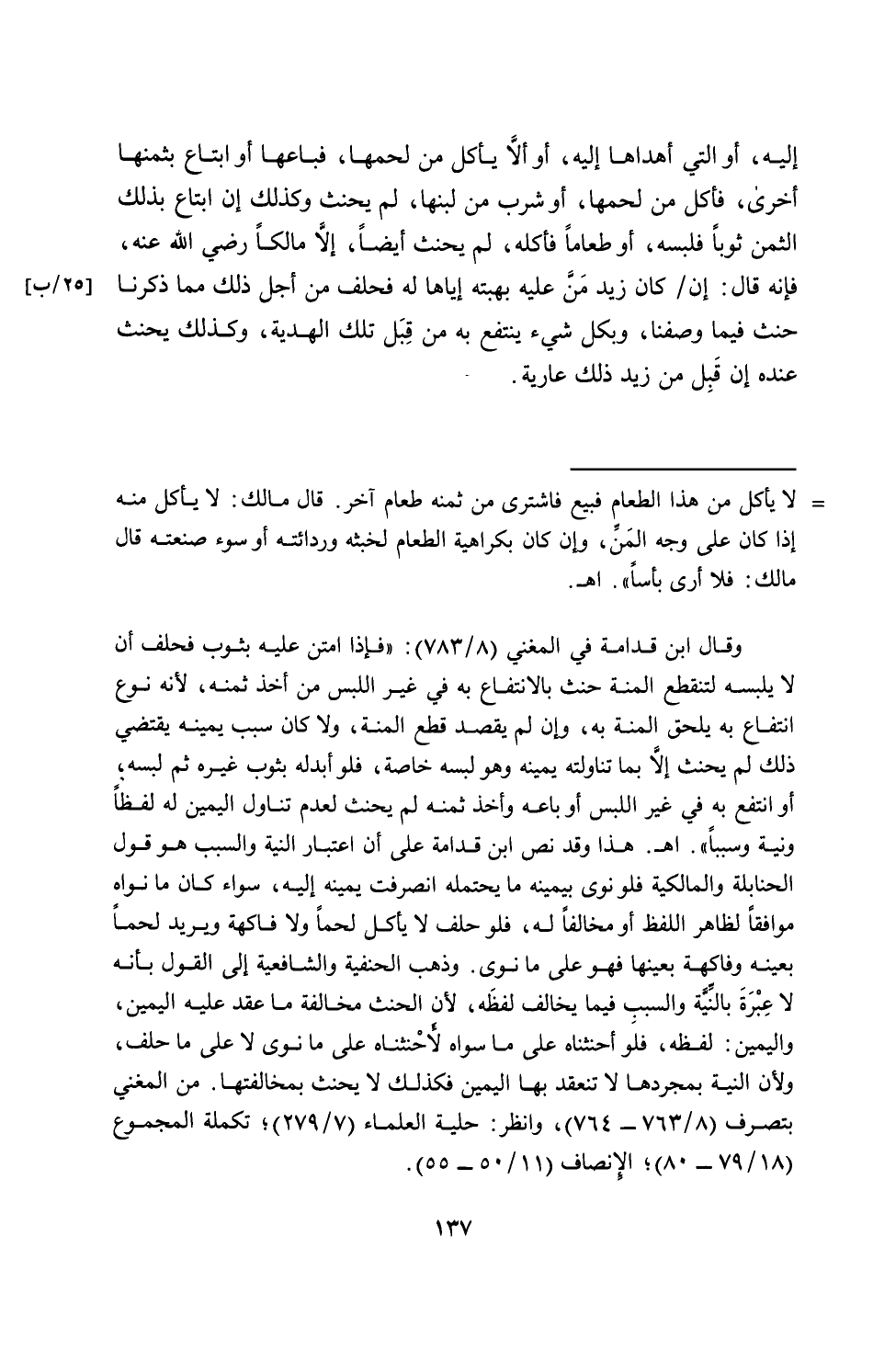 إليه، أو التي أهداها إليه، أو ألّا يأكل من لحمها، فباعها أو ابتاع بثمنها أخرى، فأكل من لحمها، أو شرب من لبنها، لم يحنث وكذلك إن ابتاع بذلك الثمن ثوبًا فلبسه، أو طعامًا فأكله، لم يحنث أيضًا، إلا مالكًا رضي الله عنه، فإنه قال: إن كان زيد منَّ عليه بهبته إياها له فحلف من أجل ذلك مما ذكرنا حنث فيما وصفنا، وبكل شيء ينتفع به من قِبَلِ تلك الهدية، وكذلك يحنث عنده إن قَبِل من زيد ذلك عارية.