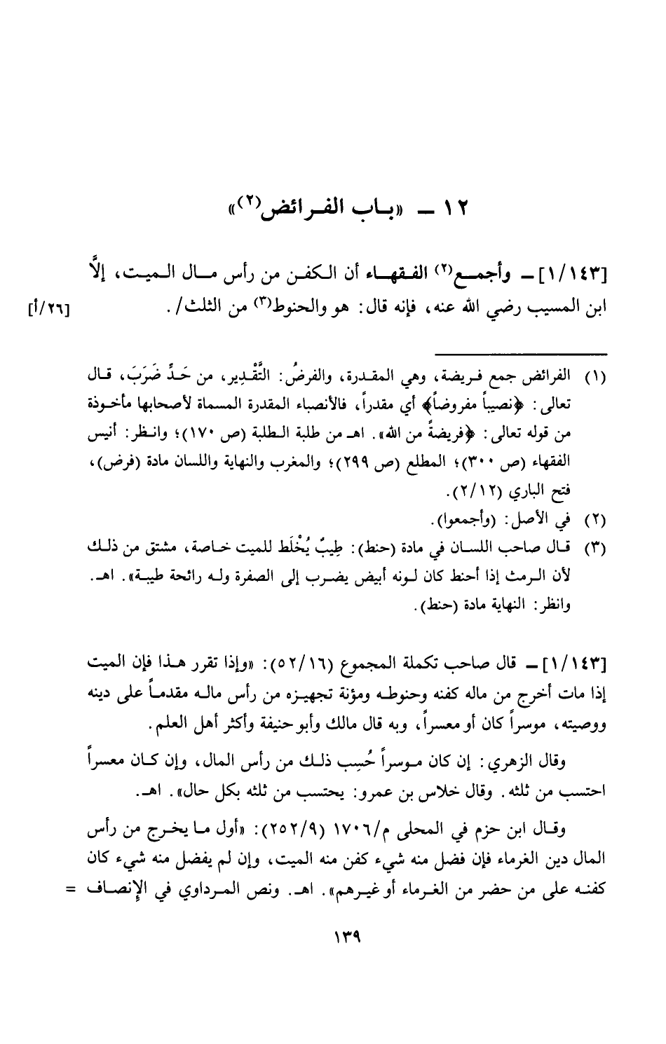 [143/ 1]- وأجمع الفقهاء أن الكفن من رأس مال الميت، إلا ابن المسيب رضي الله عنه، فإنه قال: هو والحنوط من الثلث.