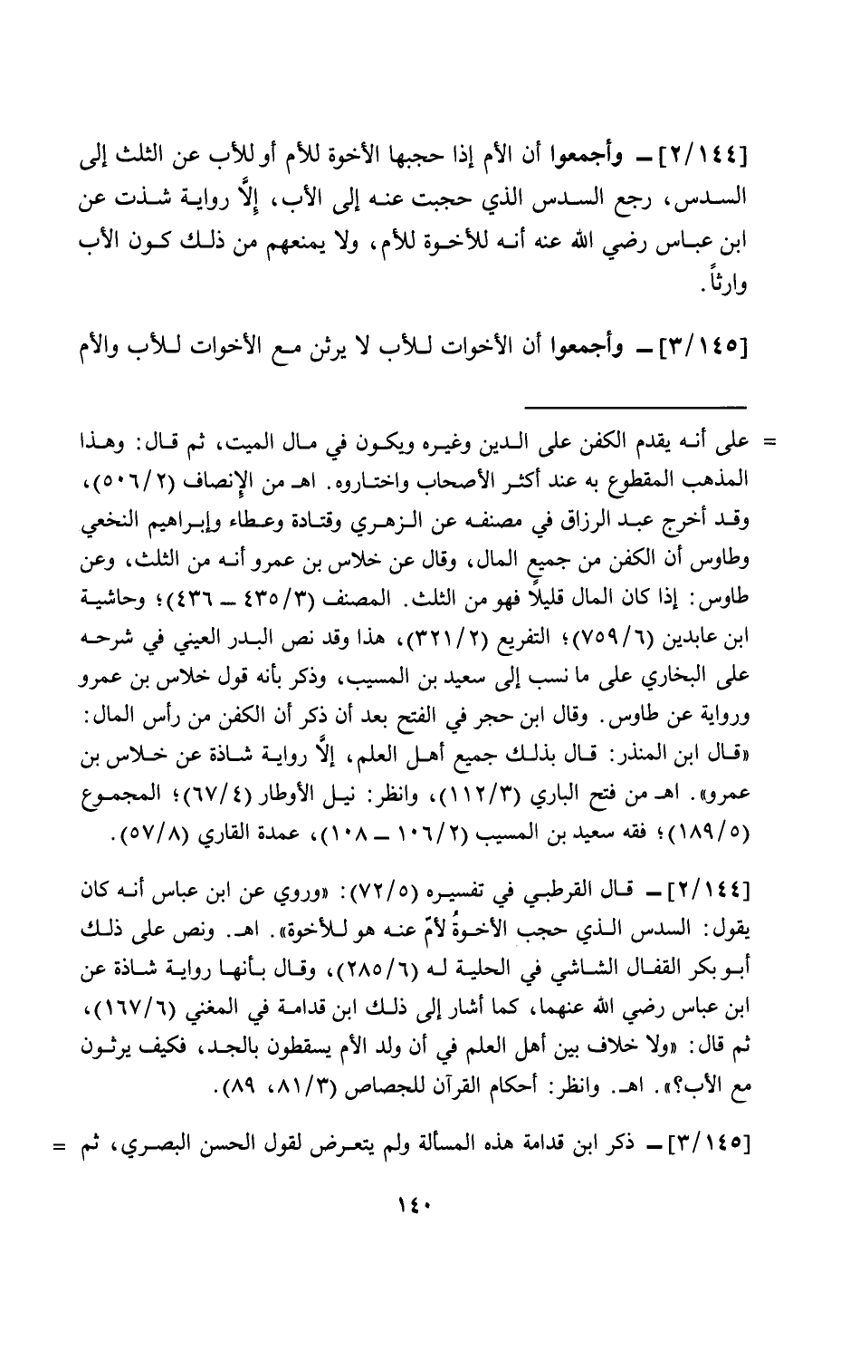 [144/ 2]- وأجمعوا أن الأم إذا حجبها الأخوة للأم أو للأب عن الثلث إلى السدس، رجع السدس الذي حجبت عنه إلى الأب، إلا رواية شذت عن ابن عباس رضي الله عنه أنه للأخوة للأم، ولا يمنعهم من ذلك كون الأب وارثًا.