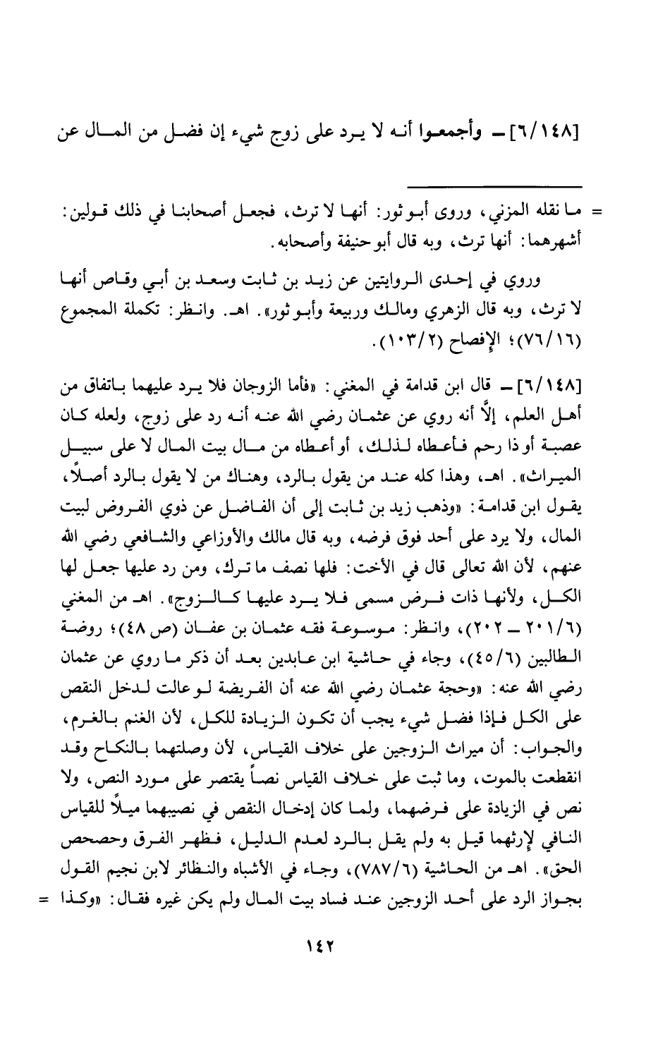 [148/ 6]- وأجمعوا أنه لا يرد على زوج شيء إن فضل من المال عن