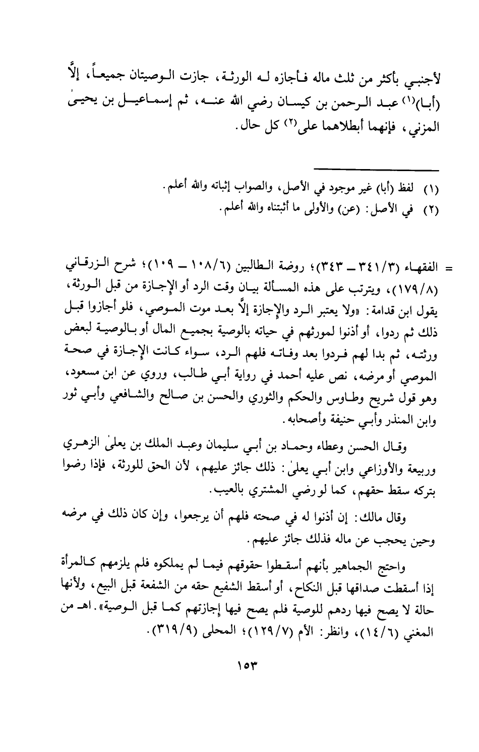 لأجنبي بأكثر من ثلث ماله فأجازه له الورثة، جازت الوصيتان جميعاً، إلا (أبا) عبد الرحمن بن كيسان رضي الله عنه، ثم إسماعيل بن يحيى المزني، فإنهما أبطلاهما على كل حال.