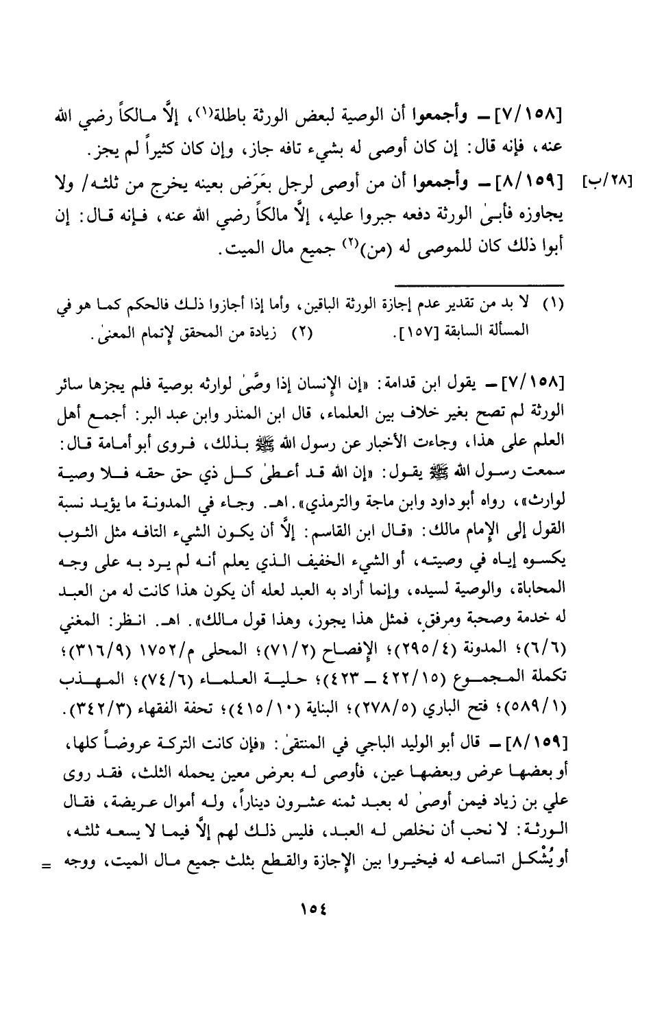 ] 158/ 7 [- وأجمعوا أن الوصية لبعض الورثة باطلة، إلا مالكاً رضي الله عنه، فإنه قال: إن كان أوصى له بشيء تافه جاز، وإن كان كثيراً لم يجز.