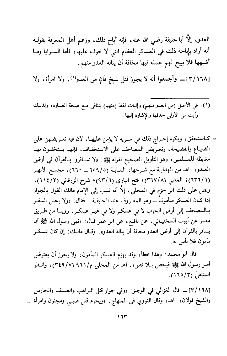] 168/ 3 [- وأجمعوا أنه لا يجوز قتل شيخ فَانٍ من العدو، ولا امرأة، ولا