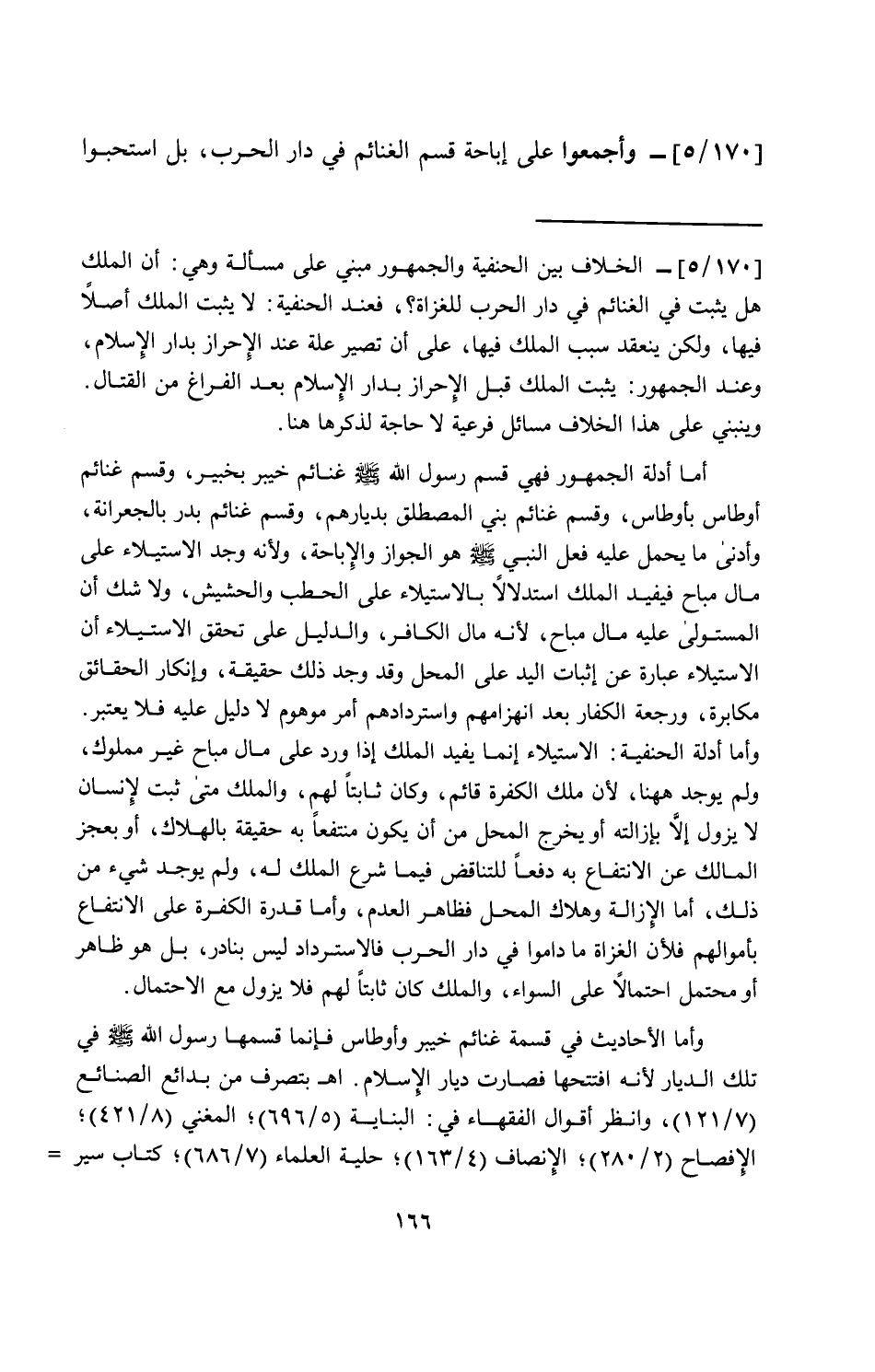 [170/ 5]- وأجمعوا على إباحة قسم الغنائم في دار الحرب، بل استحبوا