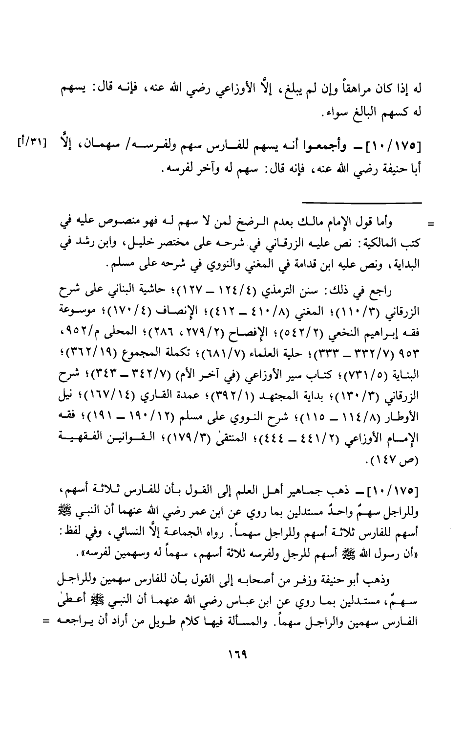 ] 175/ 10 [- وأجمعوا أنه يسهم للفارس سهم ولفرسه/ سهمان، إلا أبا حنيفة رضي الله عنه، فإنه قال: سهم له وآخر لفرسه.