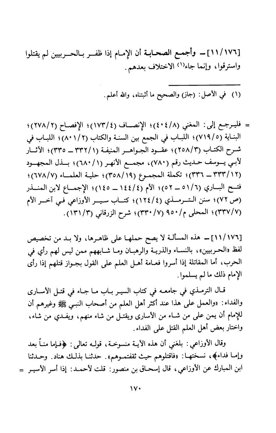 ] 176/ 11 [- وأجمع الصحابة أن الإمام إذا ظفر بالحربيين لم يقتلوا واسترقوا، وإنما جاء الاختلاف بعدهم.