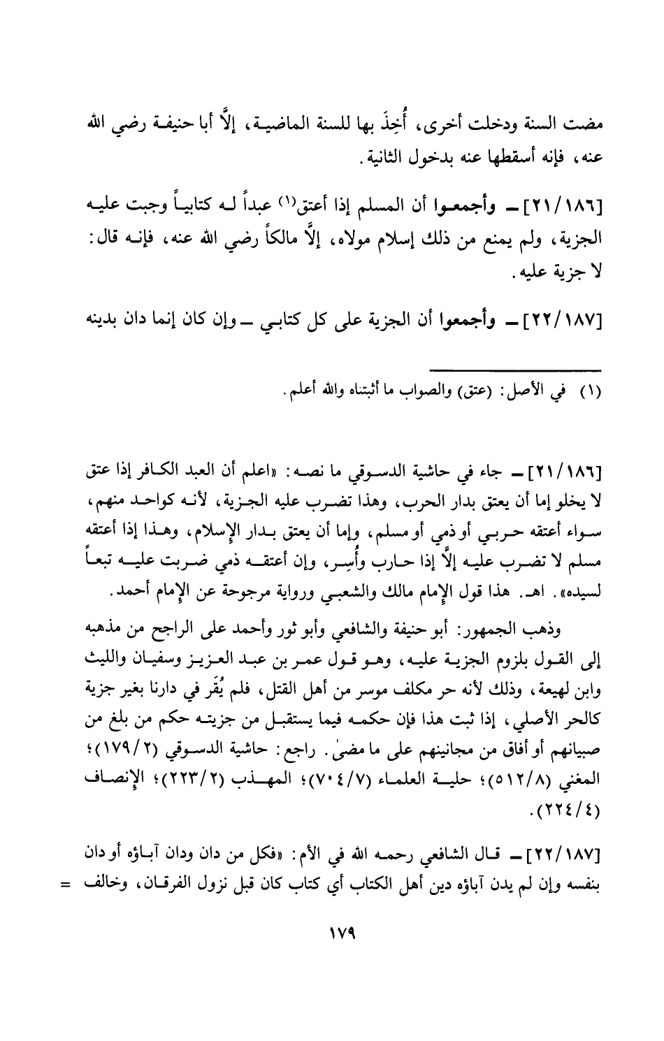 ] 186/ 21 [- وأجمعوا أن المسلم إذا أعتق عبداً له كتابياً وجبت عليه الجزية، ولم يمنع من ذلك إسلام مولاه، إلا مالكاً رضي الله عنه، فإنه قال: لا جزية عليه.