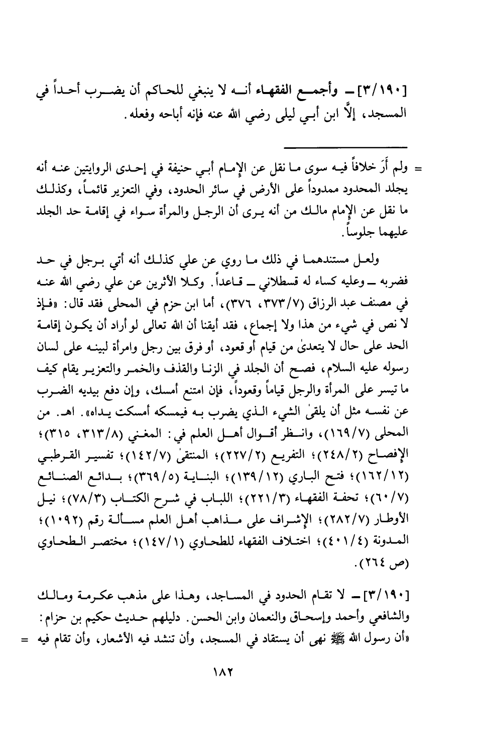 ] 190/ 3 [- وأجمع الفقهاء أنه لا ينبغي للحاكم أن يضرب أحداً في المسجد، إلا ابن أبي ليلى رضي الله عنه فإنه أباحه وفعله.