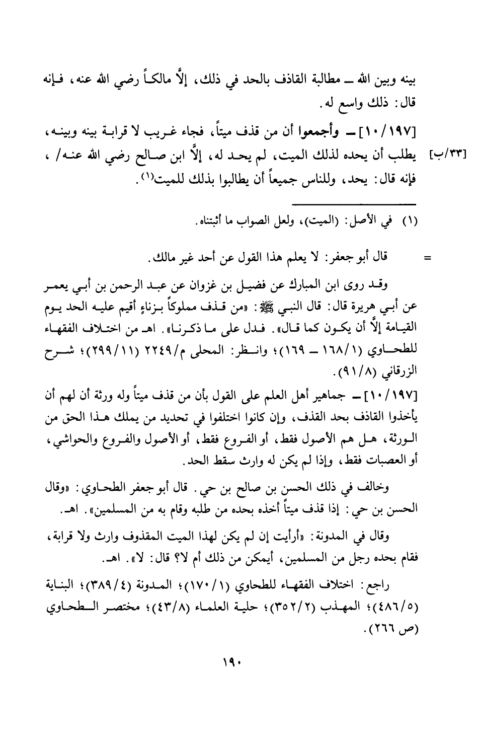 [197/ 10]- وأجمعوا أن من قذف ميتًا، فجاء غريب لا قرابة بينه وبينه، يطلب أن يحده لذلك الميت، لم يحد له، إلا ابن صالح رضي الله عنه/، فإنه قال: يحد، وللناس جميعًا أن يطالبوا بذلك للميت.