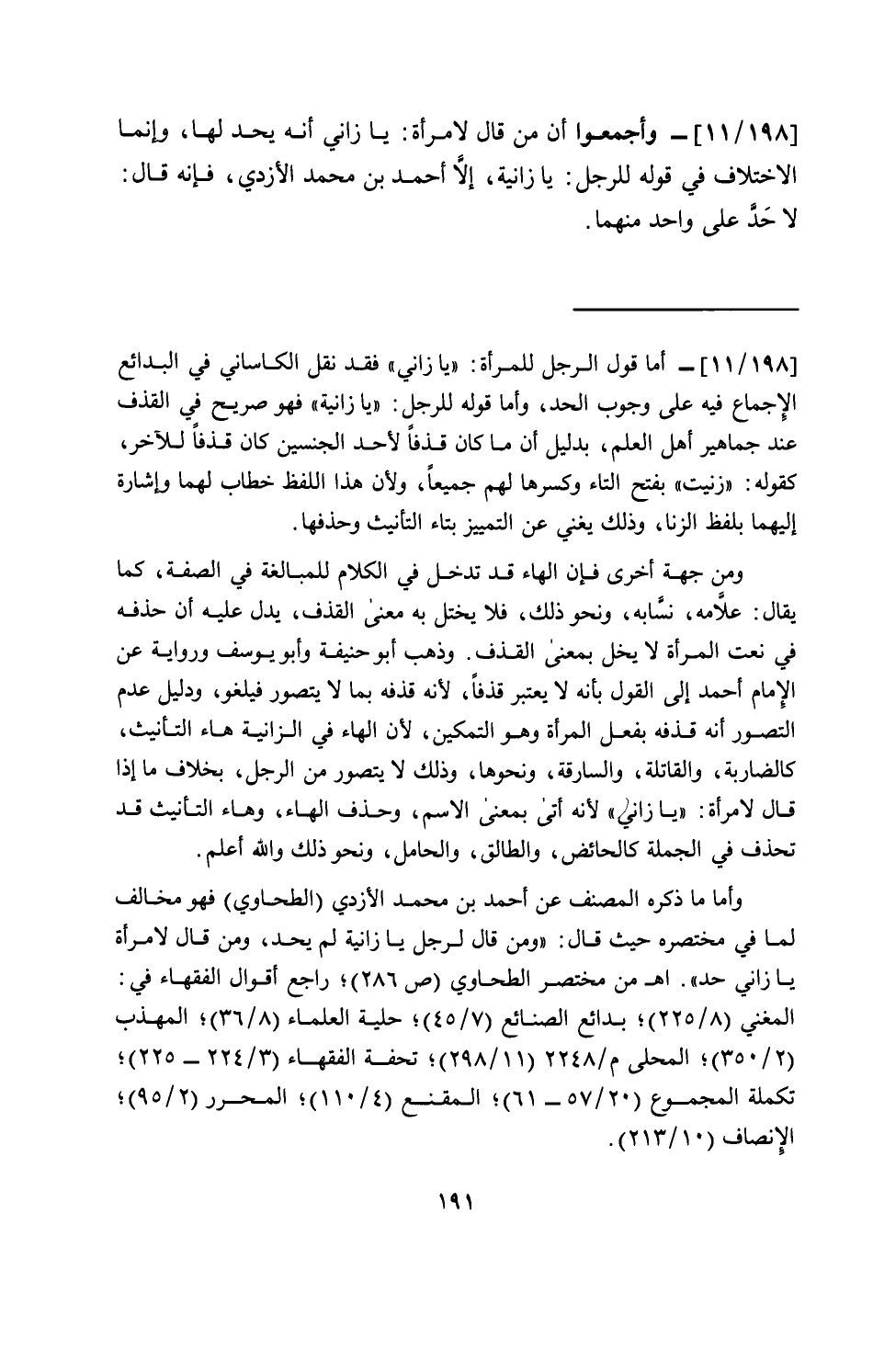 [198/ 11]- وأجمعوا أن من قال لامرأة: يا زاني أنه يحد لها، وإنما الاختلاف في قوله للرجل: يا زانية، إلا أحمد بن محمد الأزدي، فإنه قال: لا حد على واحد منهما.