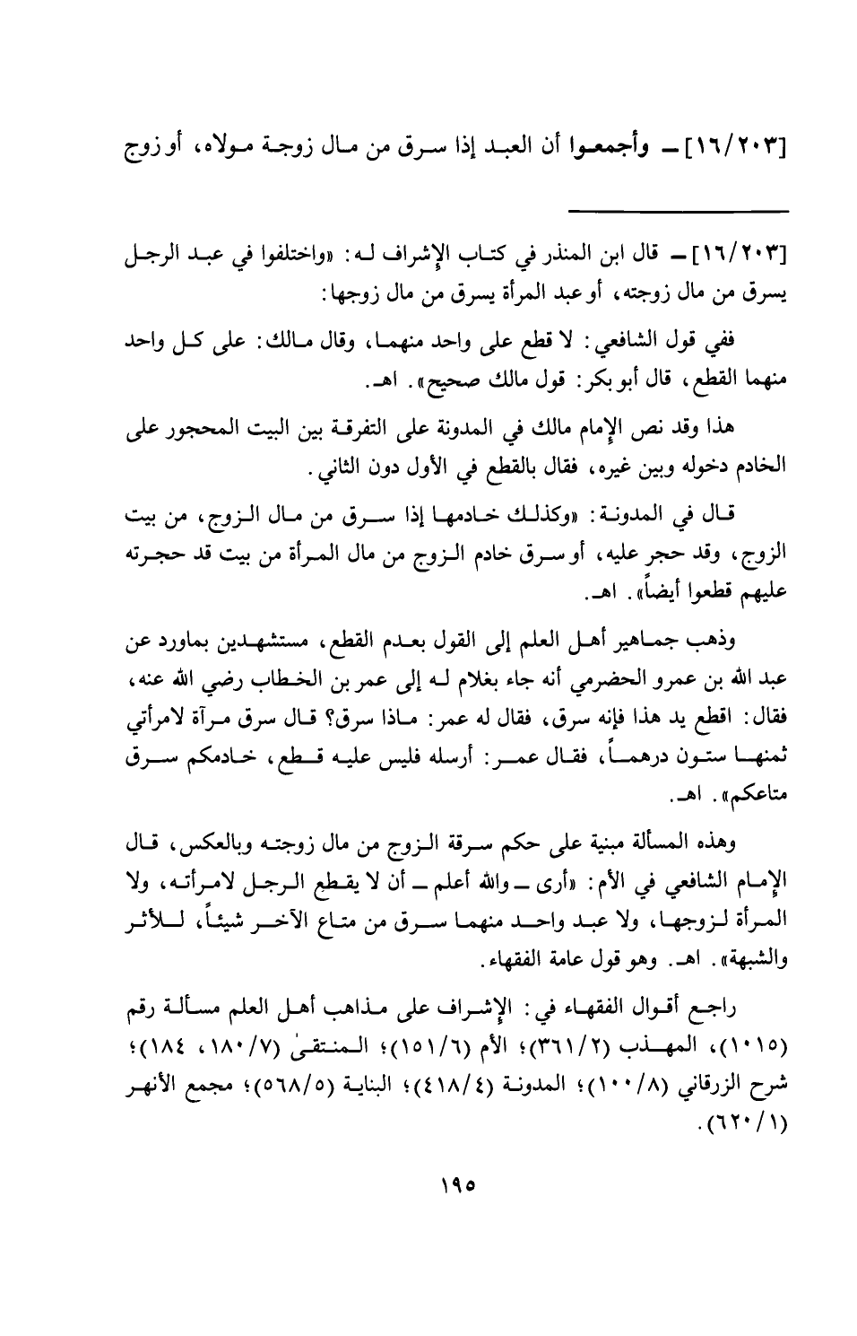 [203/ 16]- وأجمعوا أن العبد إذا سرق من مال زوجة مولاه، أو زوج