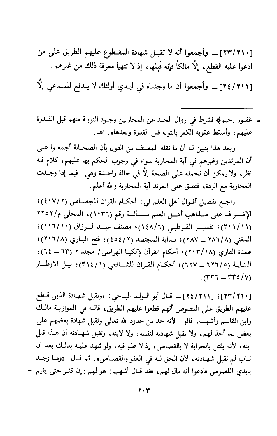 [210/ 23]- وأجمعوا أنه لا تقبل شهادة المقطوع عليهم الطريق على من ادعوا عليه القطع، إلا مالكًا فإنه قَبِلها، إذ لا تتهيأ معرفة ذلك من غيرهم.