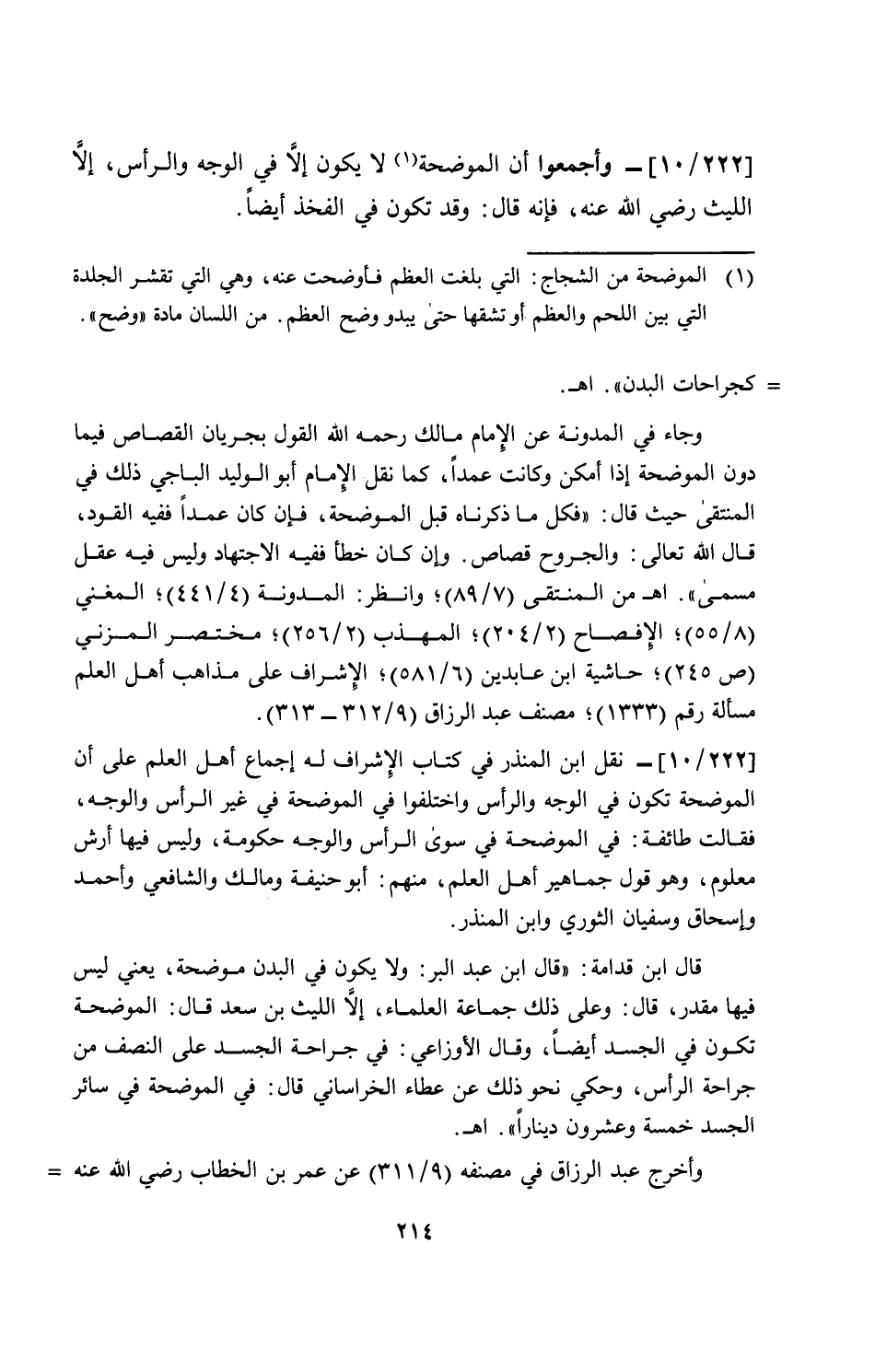 [222/ 10]- وأجمعوا أن الموضحة لا يكون إلا في الوجه والرأس، إلا الليث رضي الله عنه، فإنه قال: وقد تكون في الفخذ أيضًا.
